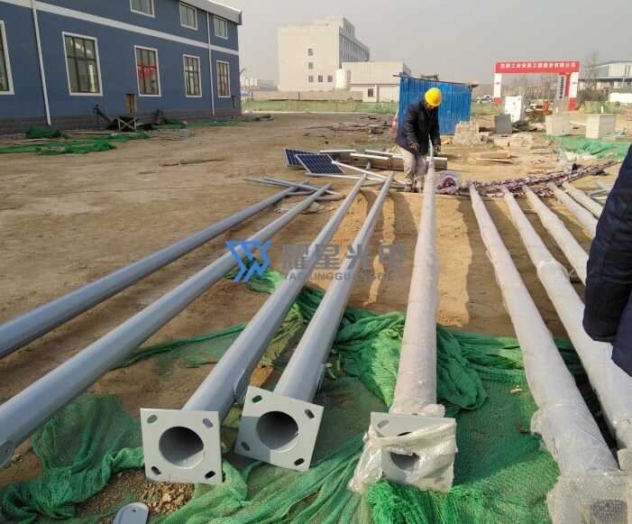 北京首都機場油庫區(qū)照明工程,場區(qū)共配置5套30米升降高桿燈和116套8米市電互補太陽能路燈
