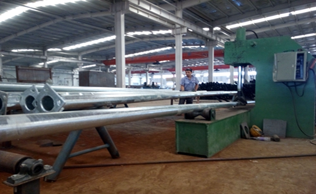還會出現彎曲現象,再加上鍍鋅時的高溫作用,鍍鋅之后之后還需要進行一次調直工作,這次調直不再像第一次那樣粗糙,而是需要精心的進行微調,看似簡單的液壓調直很容易,實際上這是一個非常細心且費眼的工作,想要調出垂直度高的路燈桿,就必須要把控好每個角度的擠壓點,且力度還要控制得當,不然就會導致過度彎曲,前功盡棄了。